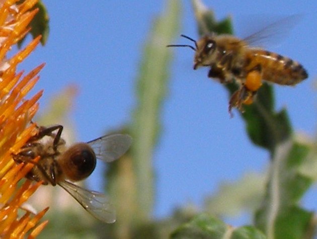 Hi Gerald, there is a bee right in the middle of the photo. She is slightly out of focus, but definitely there! Put your glasses on, and you might spot her!
