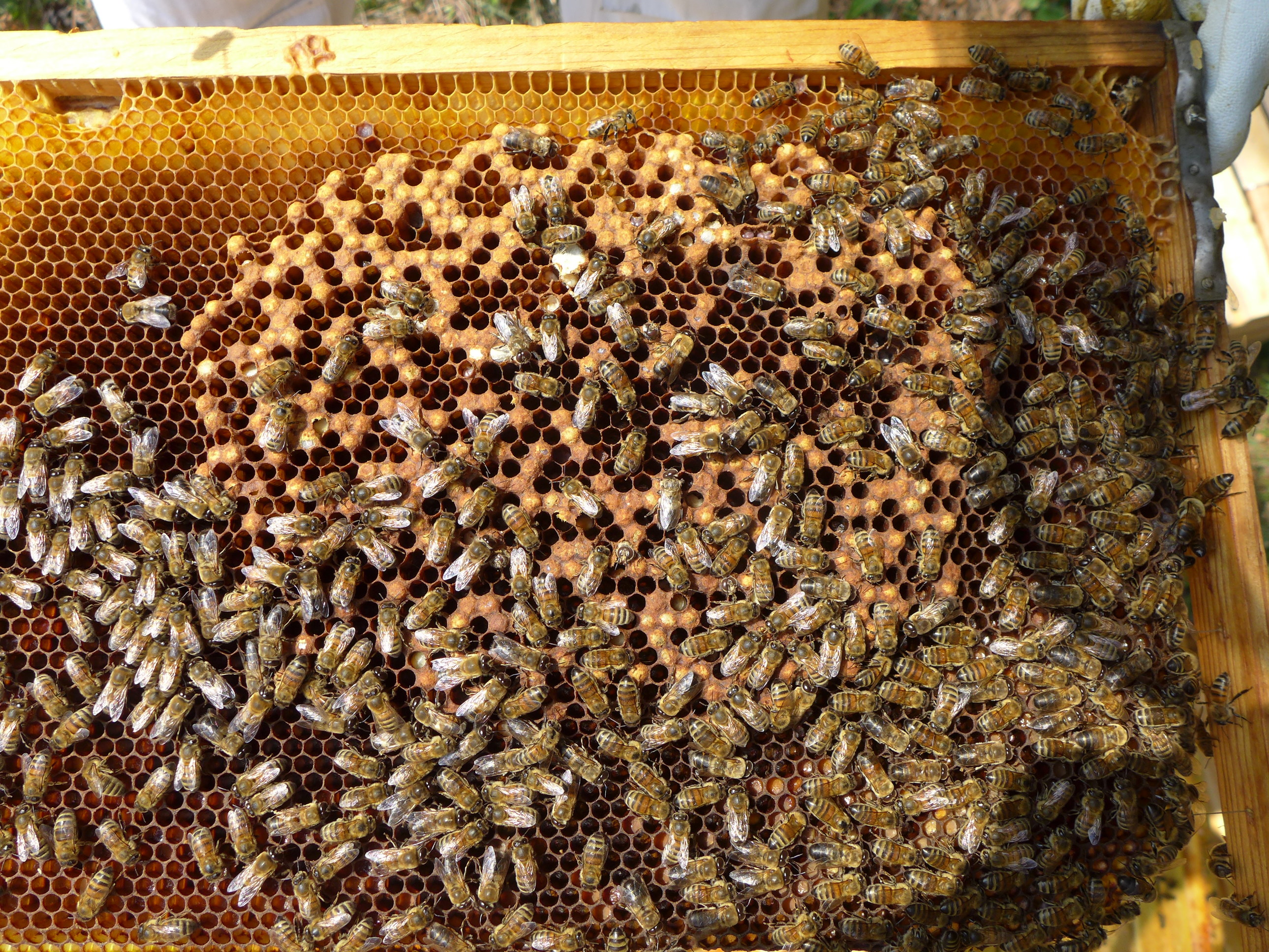 Setup is two brood boxes. Usually the bottom one is full of eggs/brood, and the top one is honey. Now the top one is honey, and the bottom one pretty empty.