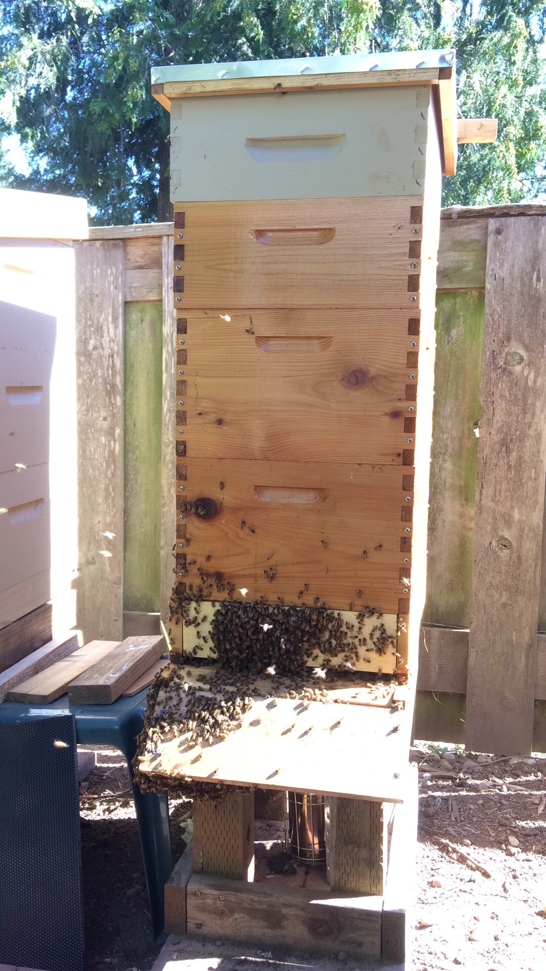 Looking into the matter a little more I realized that I could help them by adding some ventilation at the top of the stack so I used an old bee box and put in some circular vents with screening. So I started with one brood and a super and ended up with two broods, a super and a ventilated attic