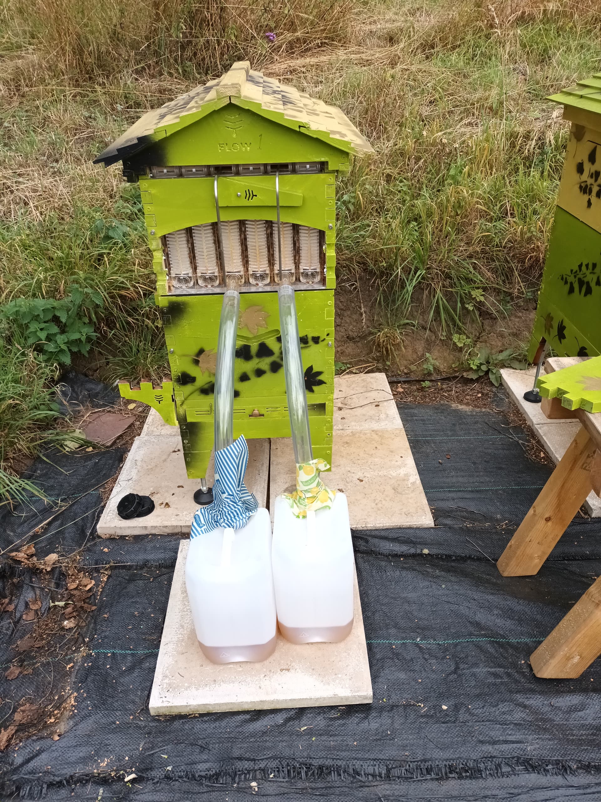 If you have connected the honey tube to a container, ensure that air can escape from the container. In your efforts to make it bee-proof, don’t make it air-tight, otherwise the honey can back up in the tube and spill over the edges of the trough inside the hive.