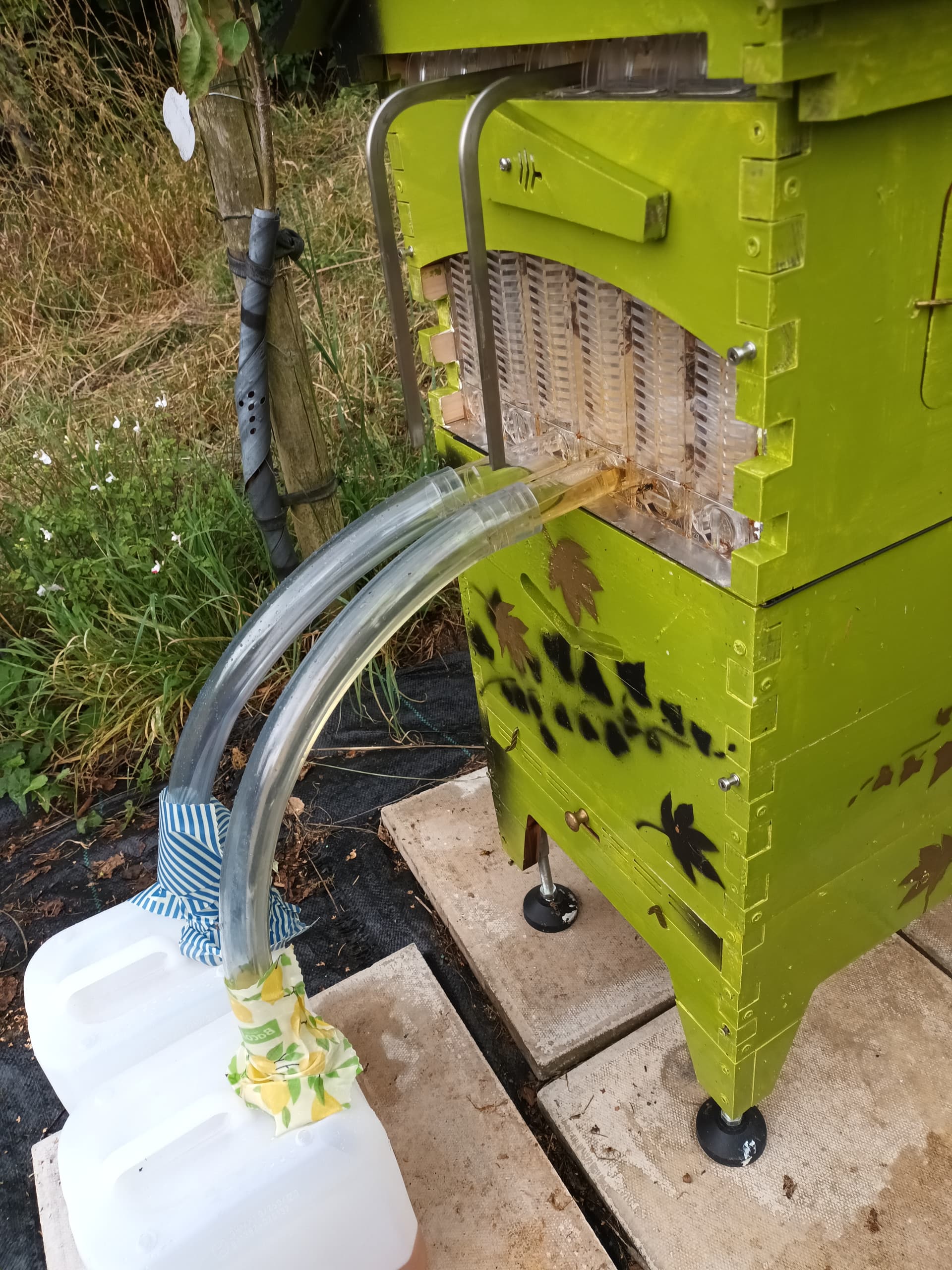 Using a standard 19mm PVC elbow and a simple elastic band perfectly solves the frustration of directing honey flow into those large 5-gallon containers!