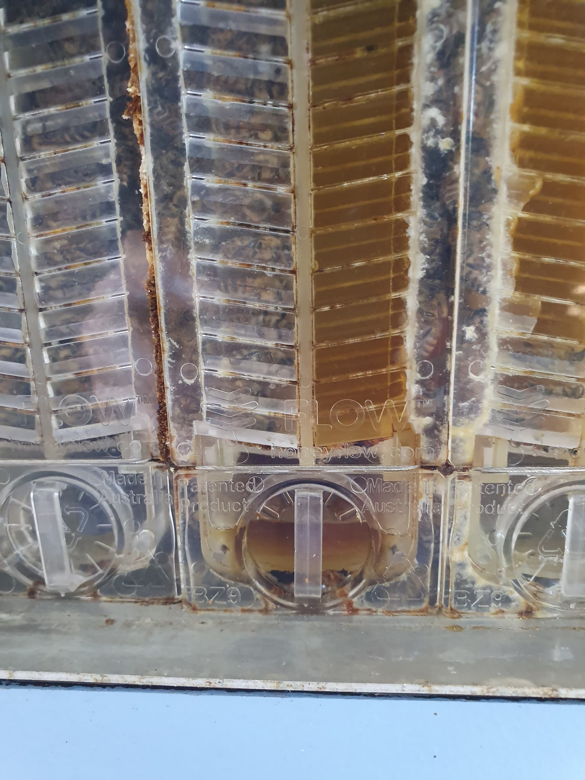 Evening all. Advice sought - the frame pictured looks like it is leaking honey into the chamber. In the year we have had the girls the left hand side of this frame never seems to fill and in the last month the chamber at the bottom is filling with honey. We did our very first harvest two weeks ago but did not draw from this frame. Is it leaking? I’ve watched the Flow Hive wire retentioning video - should we empty the frame before we remove if this is the case? Thank you in advance.