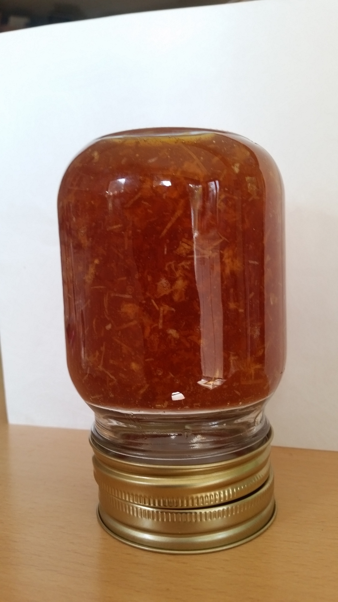 Having removed the super I discovered gel-like honey, which I extracted by taking the frame apart. Its so ‘gel-like’ that I can hold a jar of it upside down for at least 10 seconds before a dollop succumbs to gravity.