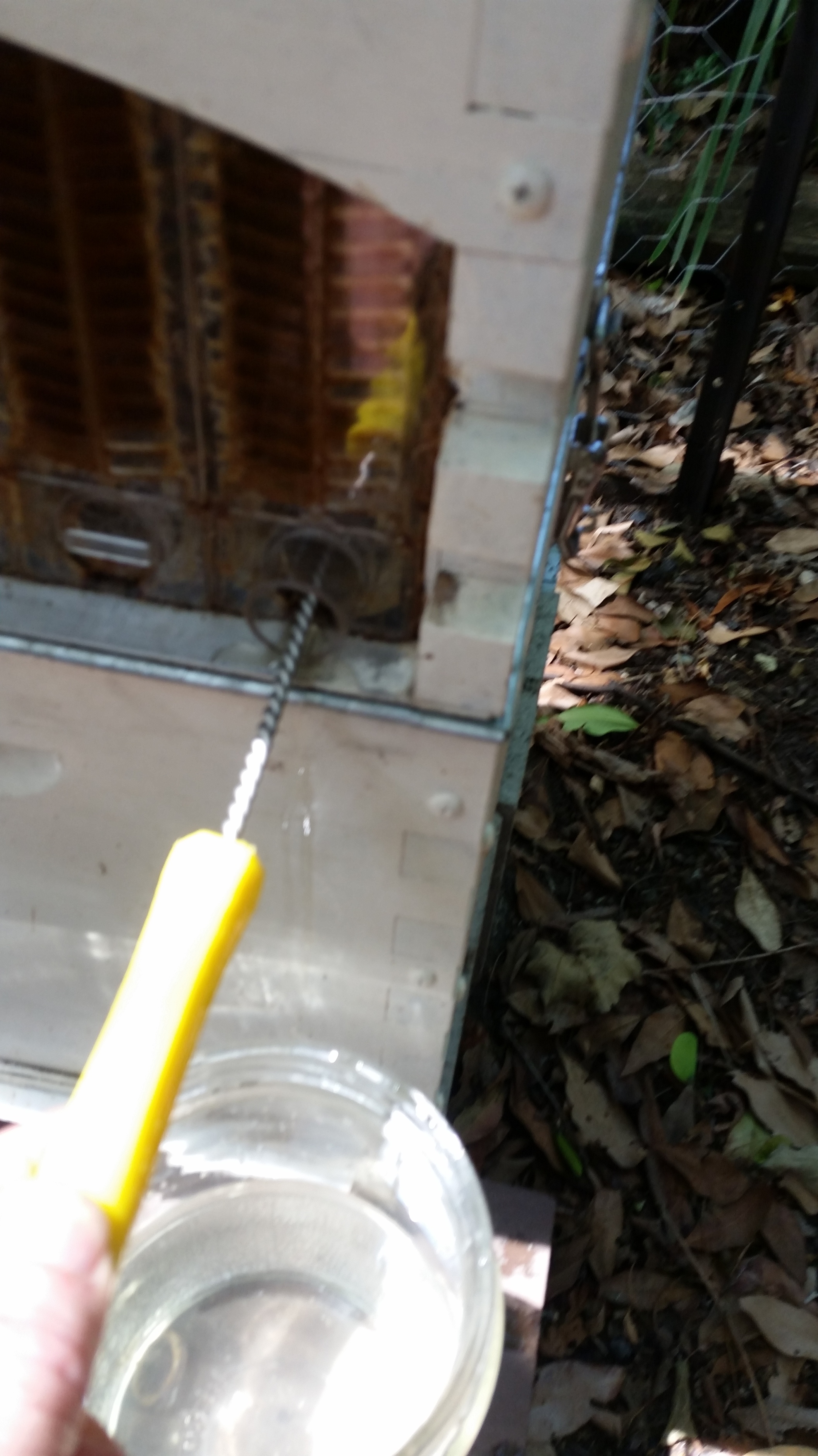 i’m using a bottle cleaning brush just like that- just as you are- immediately prior to harvest. And you are correct Jeff- I could smell that that honey was fermented. I got the brush from a Greek wholesale food place for around $4. I never put in a cut down tube like you have but will do that from now on- good idea. I also have a very fine metal mesh to filter the honey as it goes into the bucket.
