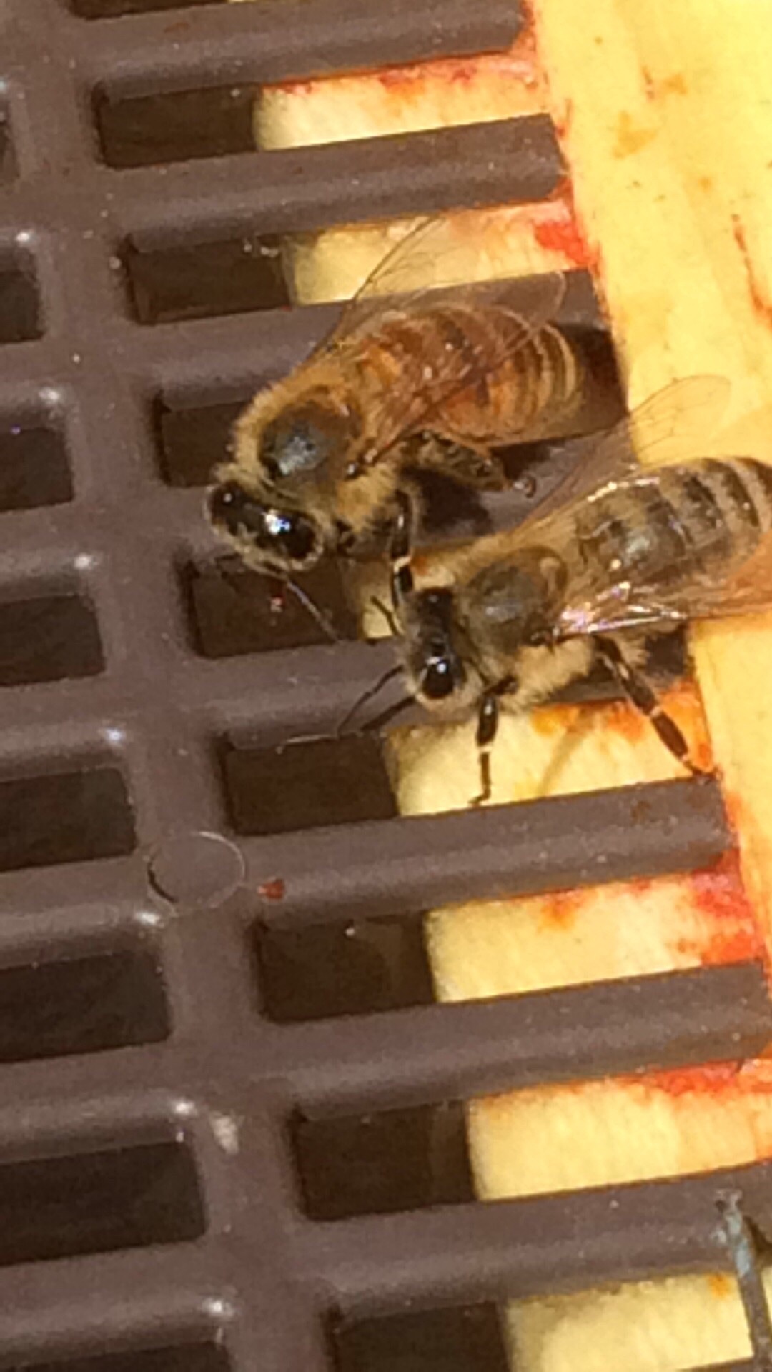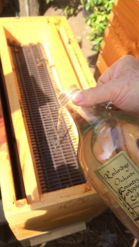 You can then tape #8 hardware cloth (or insect screen material) over the top of the hole in the inner cover. The bees can stick their tongues through the screen into the jar, but if you lift the jar up, they can’t fly out.
