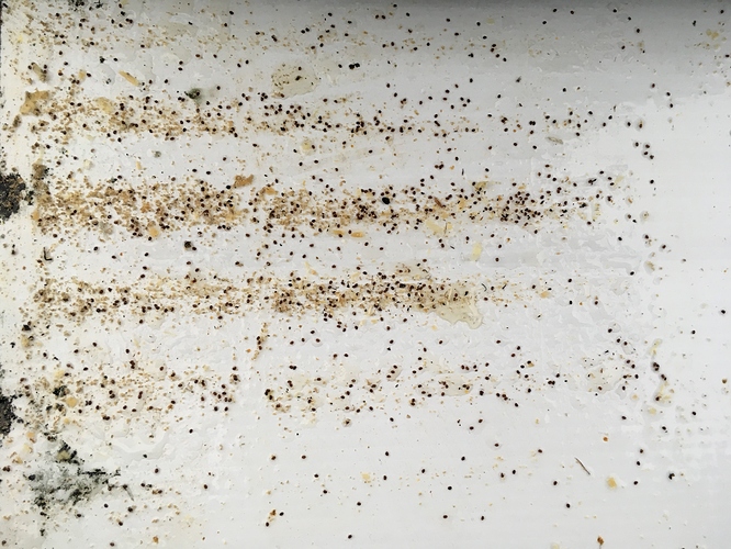 The picture attached is what the bottom board looks like one week after the second treatment since I returned and you can see that there are quite a few mites still being shed and you can also see some of the moisture I’m talking about.